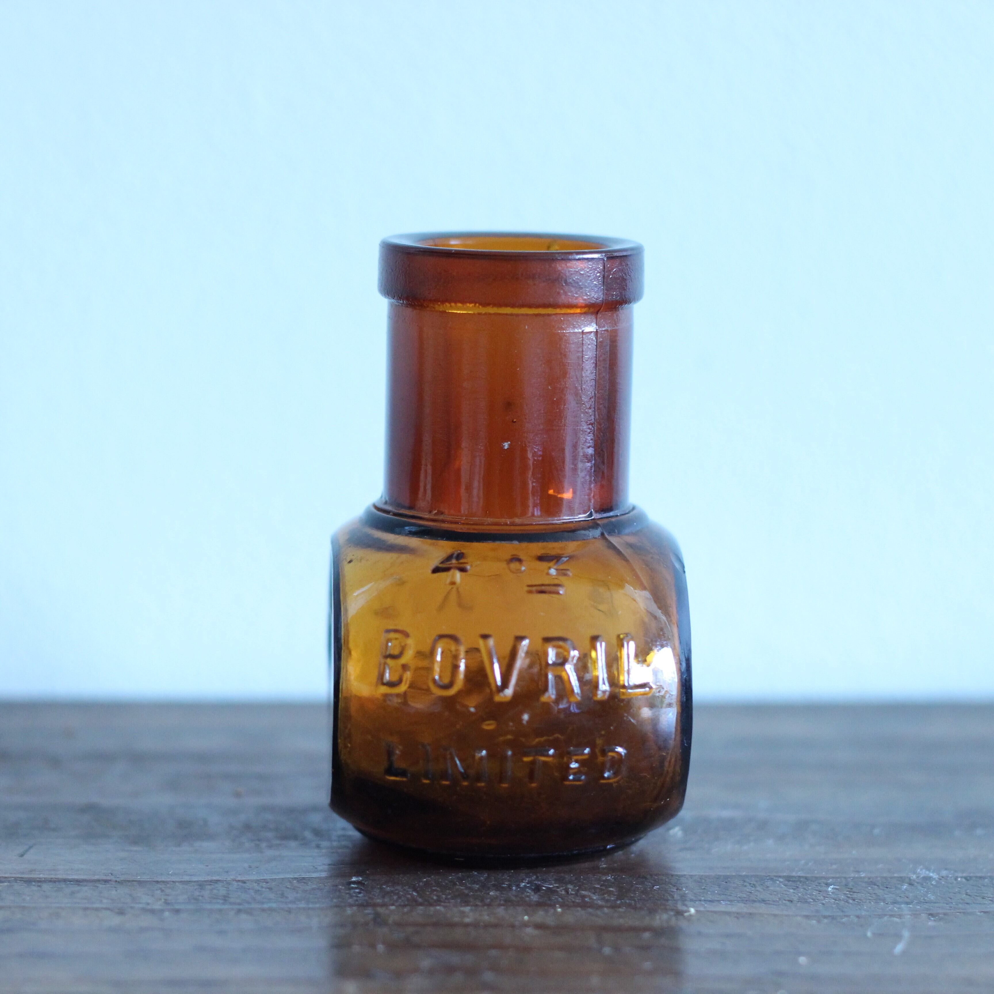 1900年代初頭に作られたBOVRIL(イギリスの会社で牛から抽出したエキスをペースト状にした物を販売している会社)のアンティークボトルです。可愛らしいサイズ感で綺麗な琥珀色が魅力的。花瓶としても、ペン立てなどのインテリア雑貨にしても最適です。