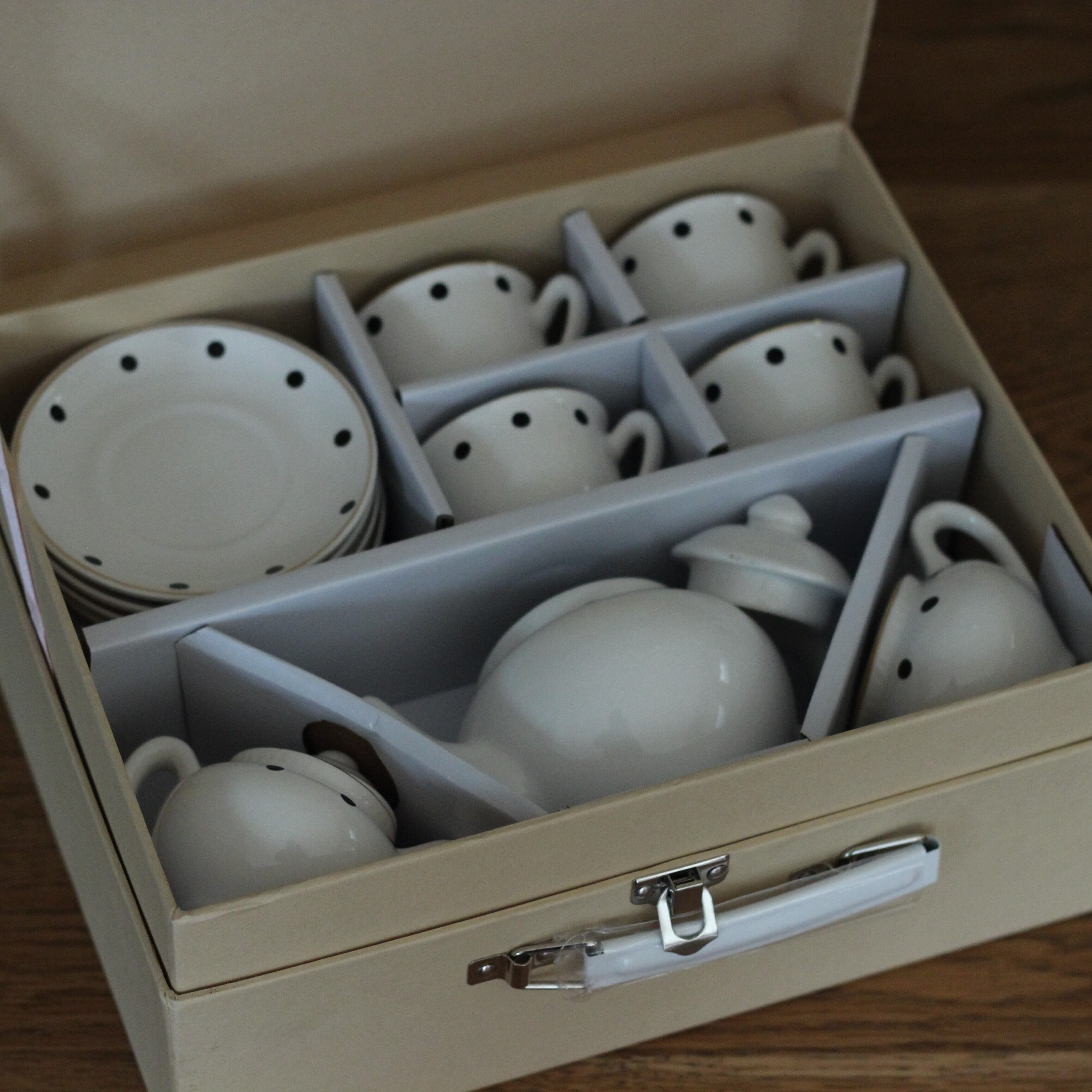 かわいいトランクケースがわくわく感をプラスさせます。磁器のモダンなデザインで、セット内容も大人さながら。