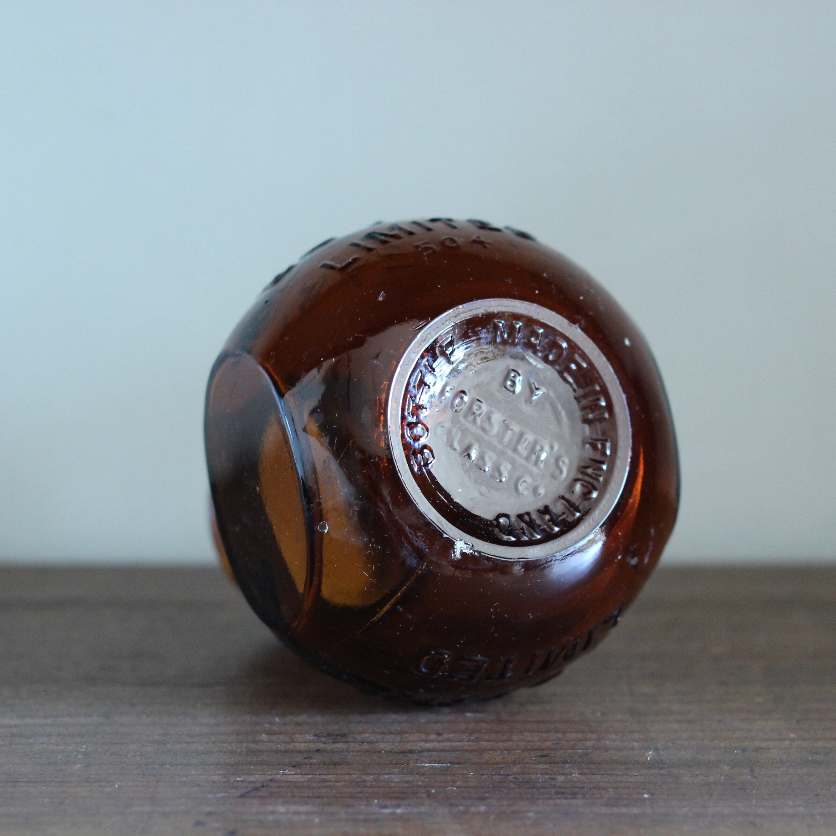 1900年代初頭に作られたBOVRIL(イギリスの会社で牛から抽出したエキスをペースト状にした物を販売している会社)のアンティークボトルです。可愛らしいサイズ感で綺麗な琥珀色が魅力的。花瓶としても、ペン立てなどのインテリア雑貨にしても最適です。